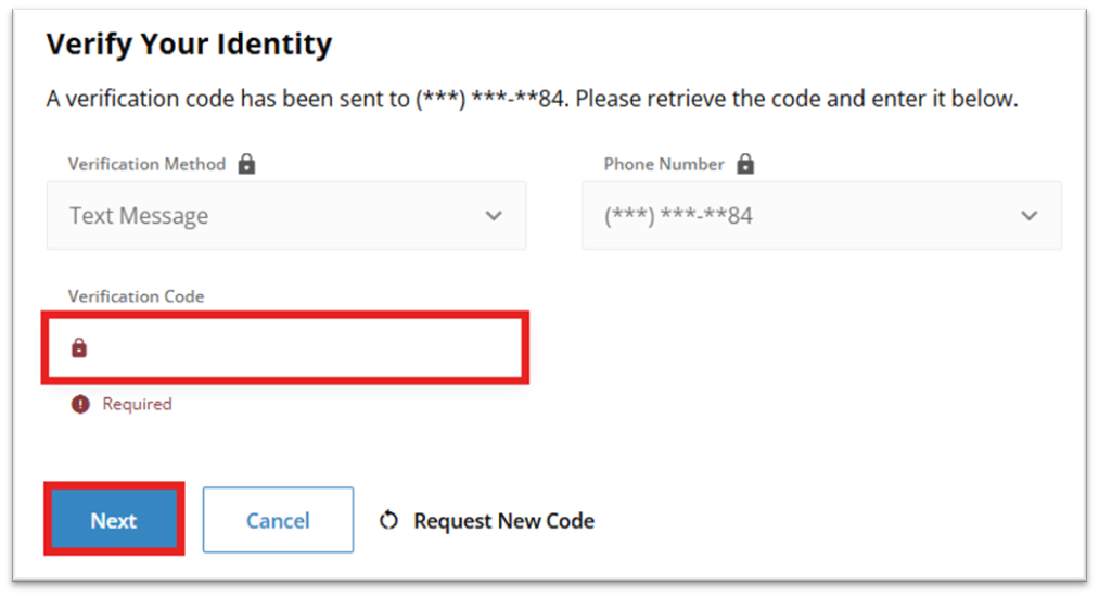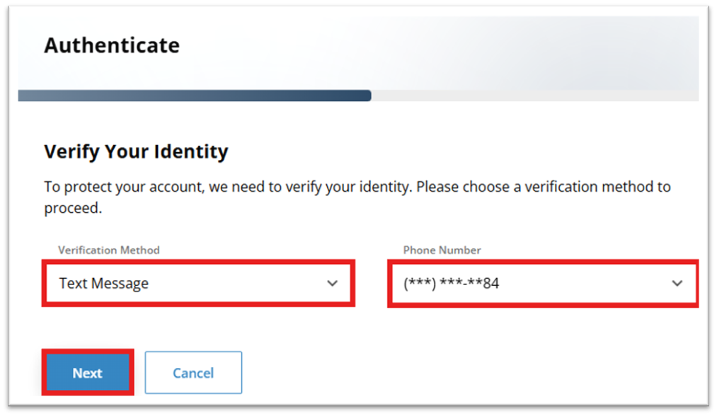 Choose a Verification Method (text message or email), select your phone number or email address, and click Next.