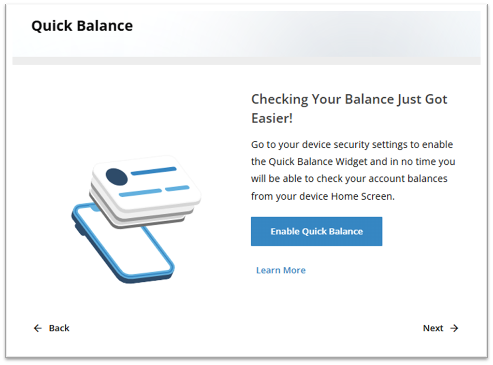 You may choose to Enable Quick Balance which would allow you to view your account balances from your device home screen, or click Next to continue.