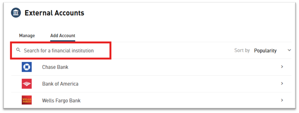 Use the Search box to locate your external Financial Institution, then click directly on it.
